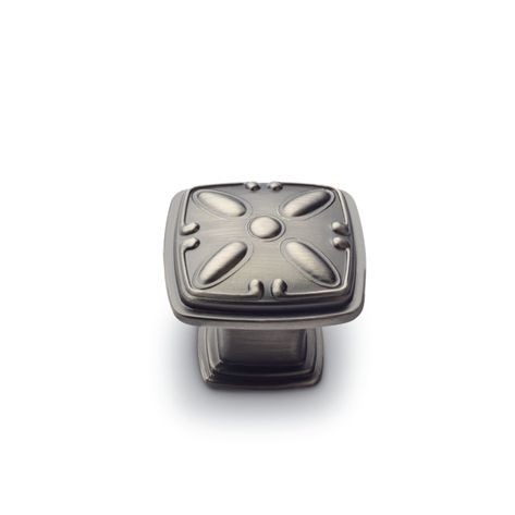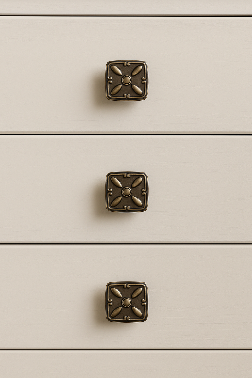 Ova ručkica (dugme) ima klasičan, kvadratni oblik sa reljefnim detaljima i antik bronzanom završnicom — idealna je za rustične,