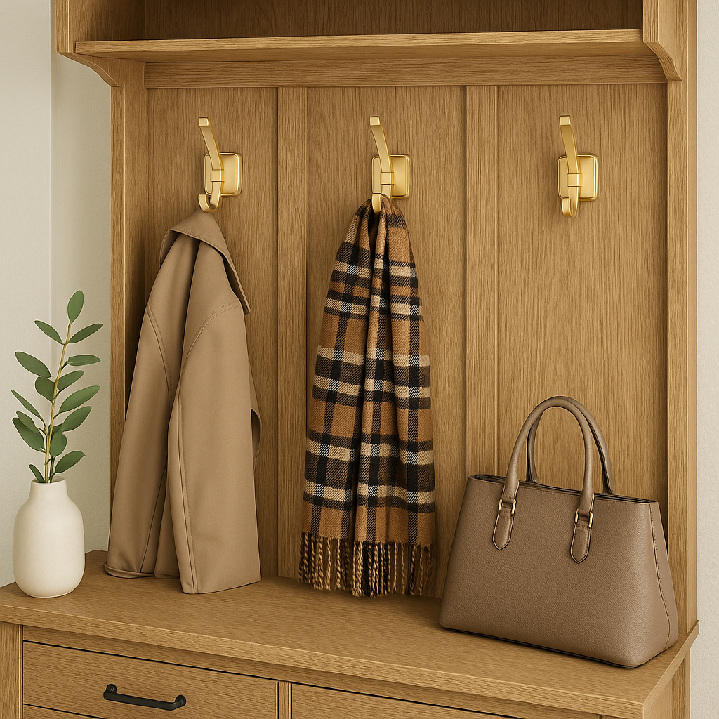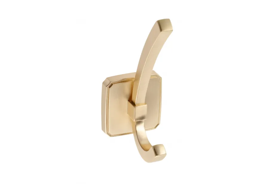 Zlatni metalni čiviluk elegantnog dizajna sa kvadratnom osnovom i dvostrukom kukom.