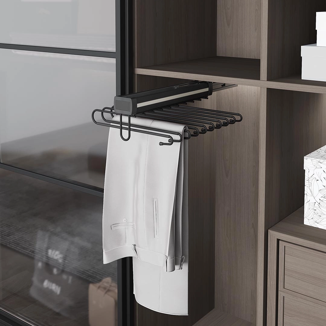 Držač pantalona omogućava da svake pantalone budu ravno, pregledno i bez gužvanja odložene – sve Vam izlazi ispred jednim potezom.