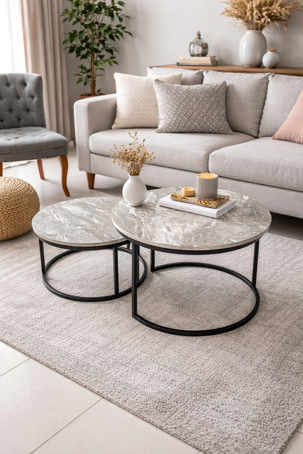 Ploče imaju elegantan mermerni dekor u sivim i bež tonovima, koji daje sofisticiran i prirodan izgled, dok metalno postolje kružnog oblika obezbeđuje stabilnost i vizuelnu lakoću.
