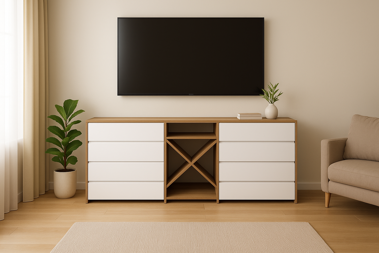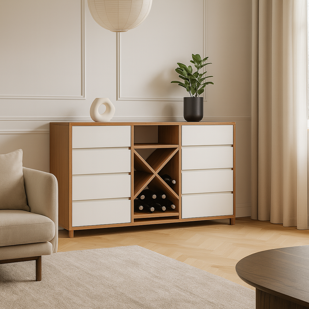 Topao ton iverice u dezenu drveta i beli frontovi daju elegantan izgled,