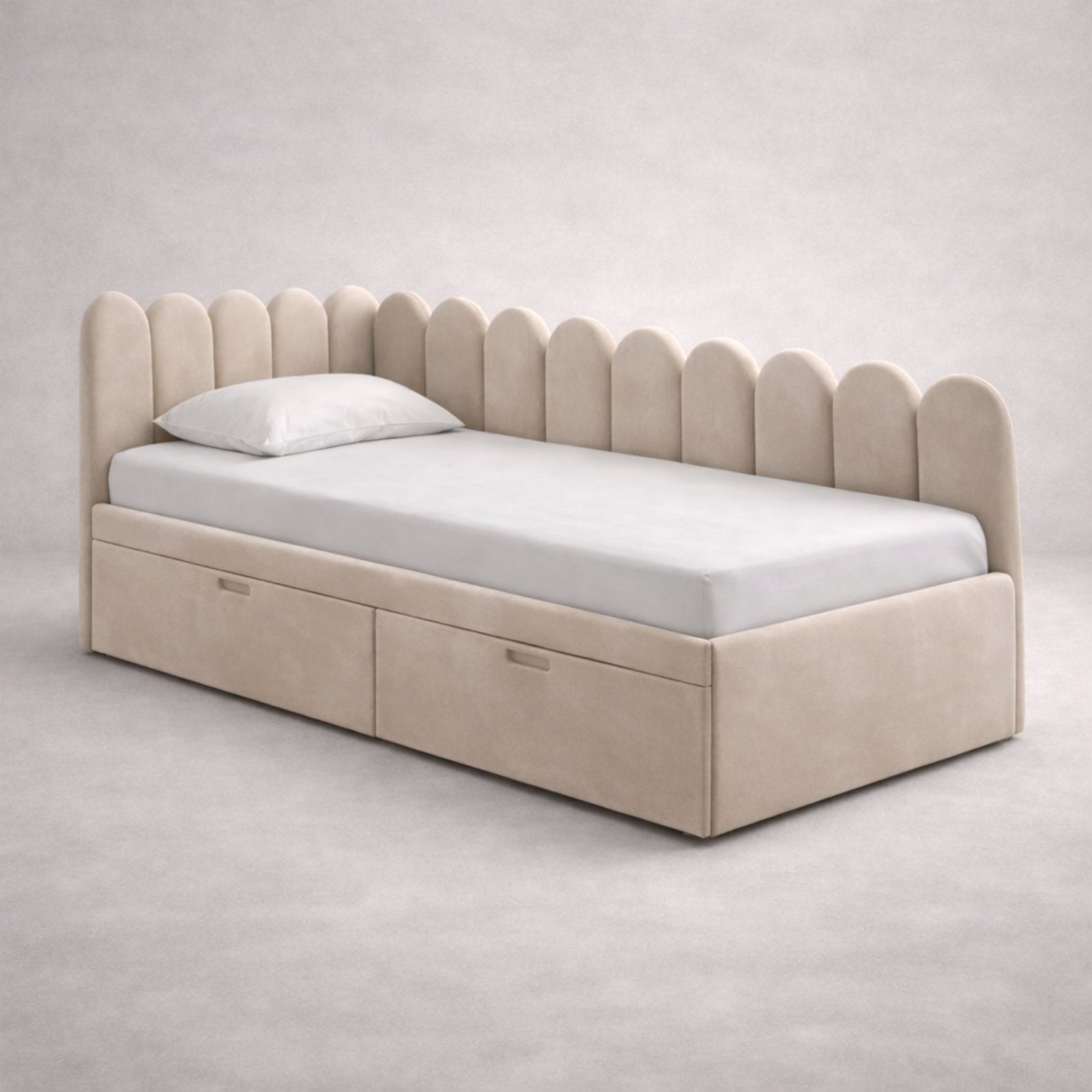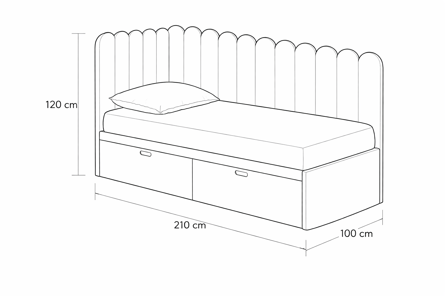 Prepoznatljivo zaobljeno uzglavlje u segmentima pruža vizuelnu mekoću i dodatnu udobnost, dok praktične fioke omogućavaju maksimalno iskorišćen prostor.