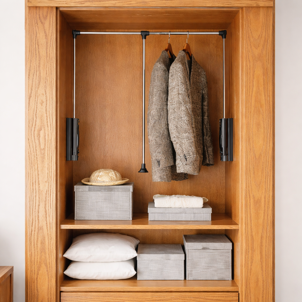 Garderobni lift mehanizam omogućava lako spuštanje garderobe iz visokih ormara na dostupnu visinu, bez saginjanja i napora. Idealan je za košulje, sakoe, jakne i kapute, posebno u ormanima visine 220–240 cm, gde je gornja zona teško dostupna.