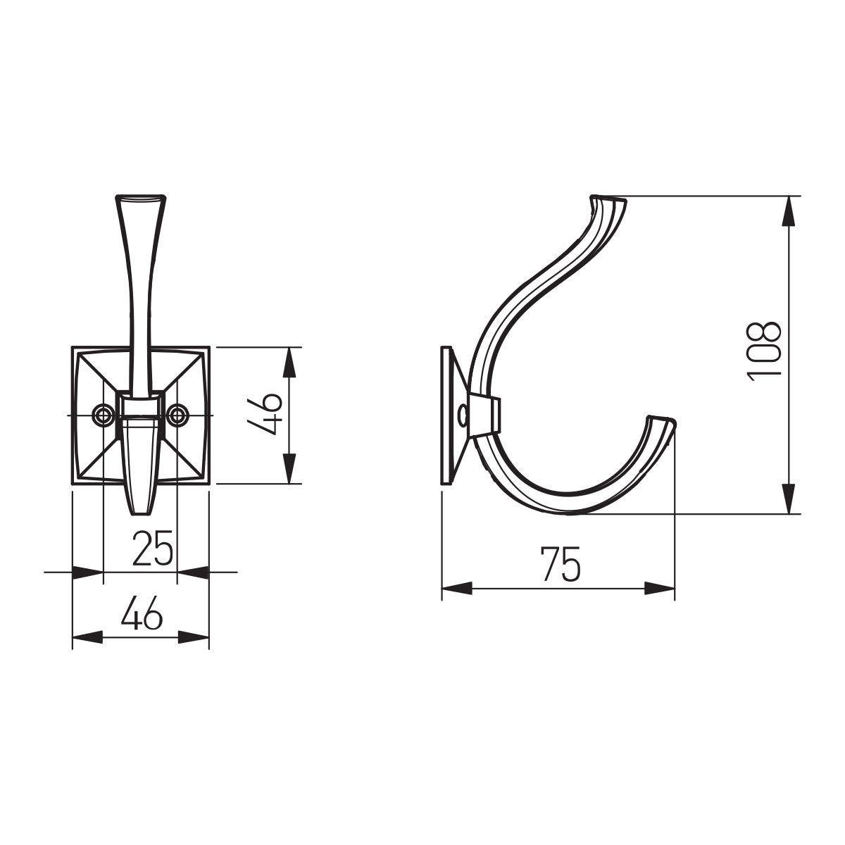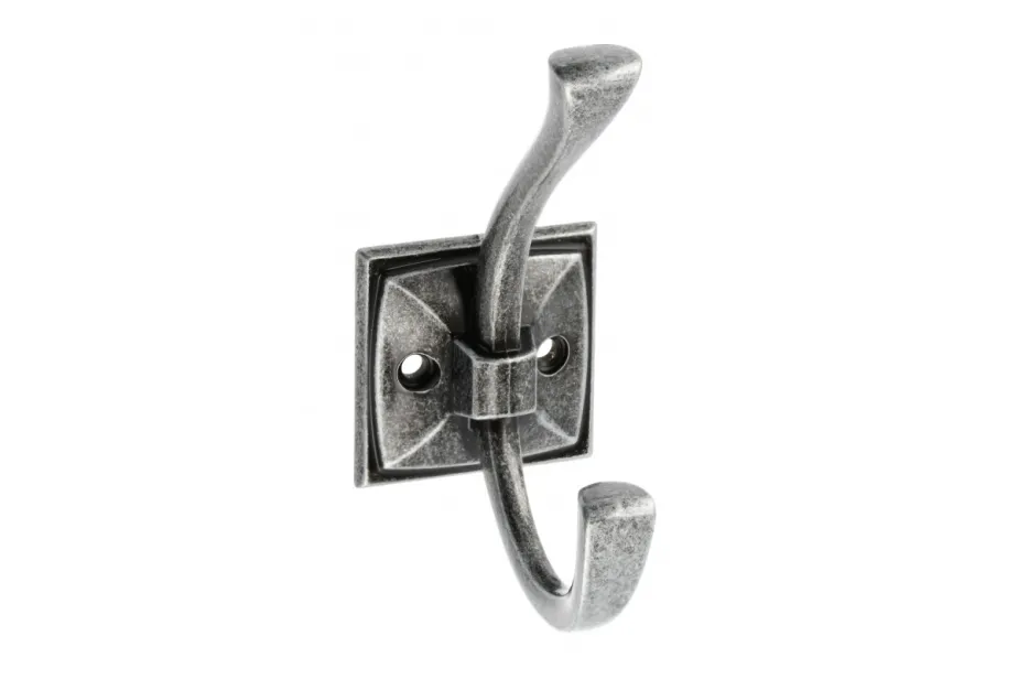 Ima dva elegantno zakrivljena kuka – jedan gornji za kapute, a donji za torbe ili marame.