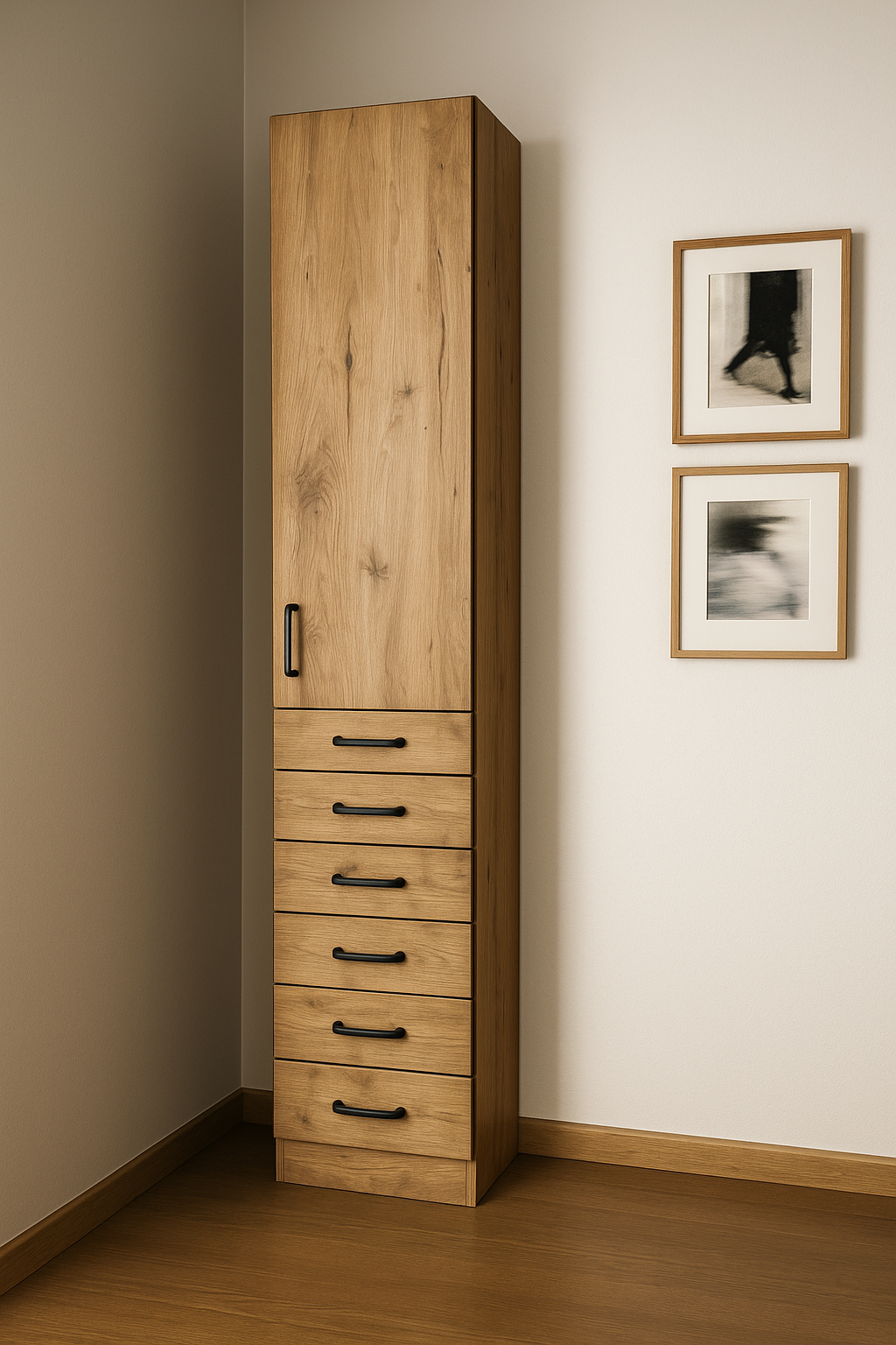 Visoki orman od izdržljive iverice u dezenu prirodnog drveta pruža savršenu organizaciju garderobe i sitnog veša.