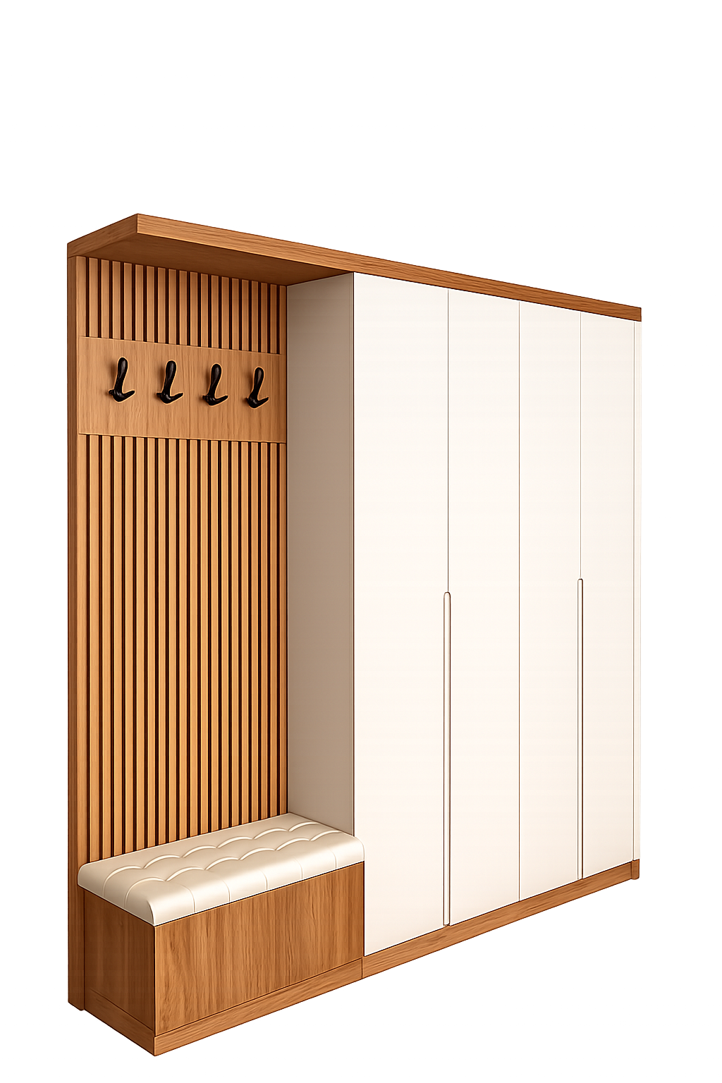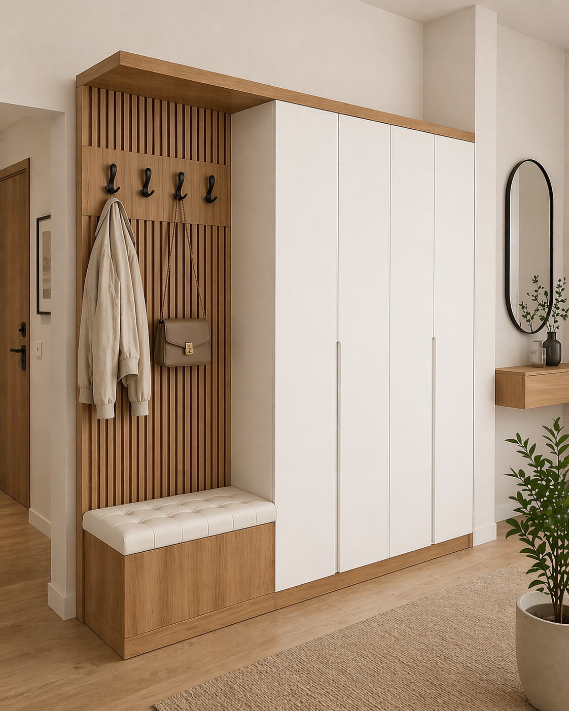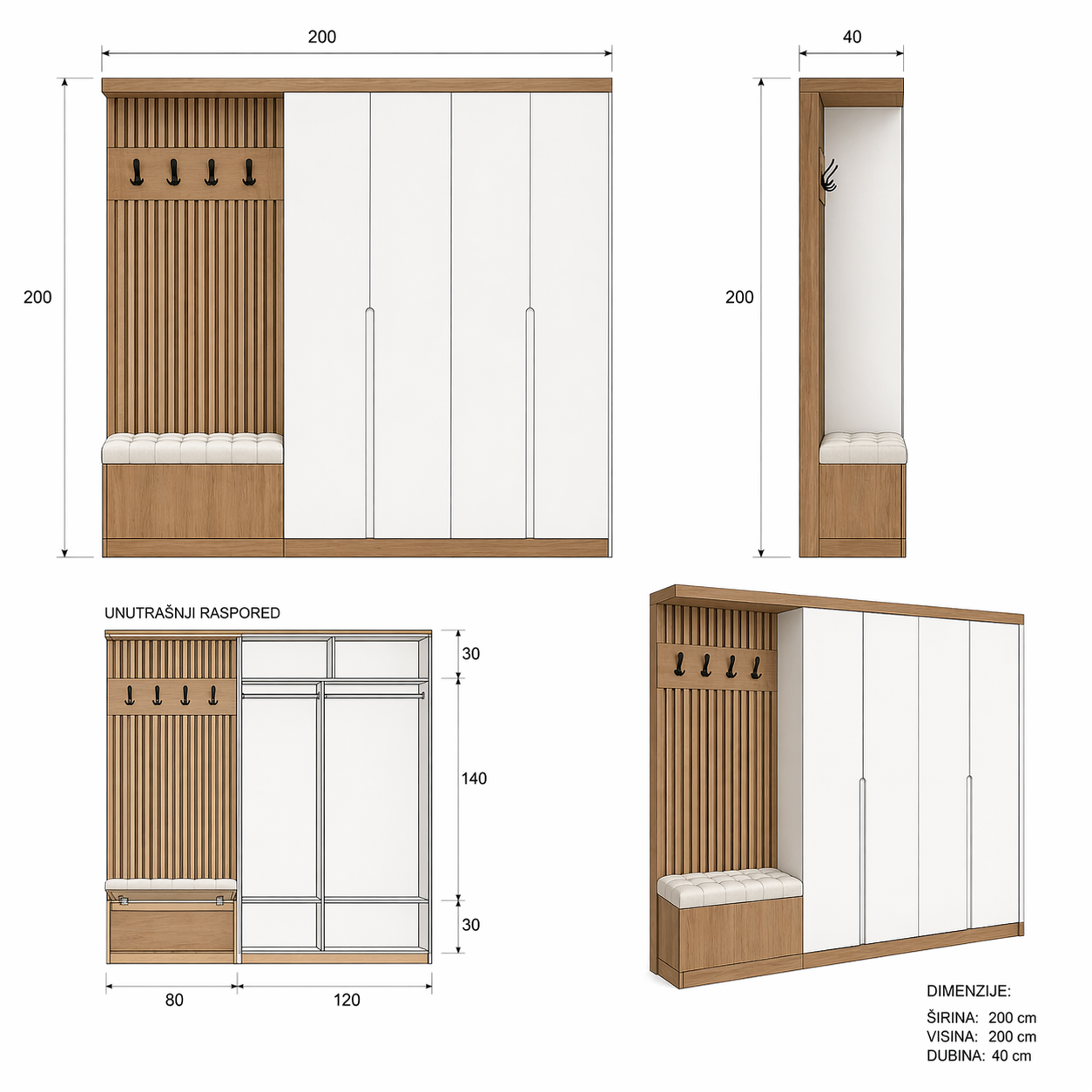 Centralni deo čini tapacirana klupa sa prostorom za odlaganje, dok vertikalne letvice sa čivilucima donose dodatnu funkcionalnost i estetski akcenat. Sa strane se nalazi prostrani garderober sa čistim linijama i skrivenim rukohvatima, savršen za organizaciju jakni, obuće i dodataka.